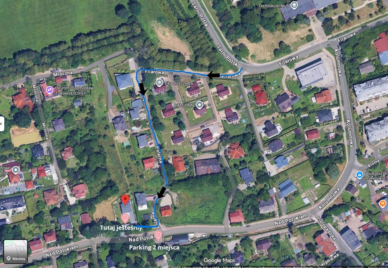 Drodzy Klienci, mamy dla Was ważną informację W związku ze zmianą organizacji ruchu na ulicy Polarnej, która stała się ulicą jednokierunkową, zmienił się również sposób dojazdu do naszego punktu. Wjazd na ul. Polarną możliwy jest wyłącznie od strony ul. Filarowej / Sarni Potok Nie ma już możliwości skrętu z ul. Nad Potokiem — obowiązuje tam zakaz wjazdu i zakaz skrętu.Wiemy, że wcześniej wielu z Was dojeżdżało do nas skręcając bezpośrednio z ul. Nad Potokiem, jednak obecne oznakowanie uniemożliwia taki manewr. Zmiany te nie są od nas zależne, dlatego na mapce pokazujemy aktualną, prawidłową trasę dojazdu „na około”, aby bez problemu do nas trafić. Dodatkowo informujemy, że przy ul. Nad Potokiem (miejsce zaznaczone na mapce) pojawiły się 2 miejsca parkingowe, z których można wygodnie zaparkować i dojść do nas pieszo — bez konieczności objeżdżania okolicznych ulic.Dziękujemy za wyrozumiałość i przepraszamy za wszelkie niedogodności Jeśli macie pytania — jesteśmy do Waszej dyspozycji.